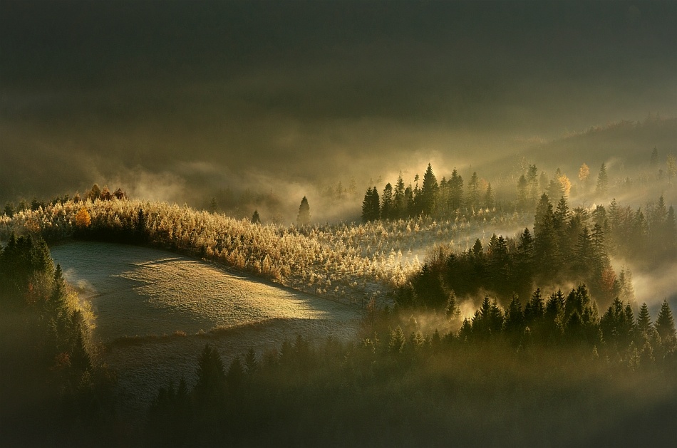 The Gorce mountains I'm describing here are very atmospheric at any time of the year, but it's best to shoot there in the fall. For this photo, I decided to go there once again to admire the beauty of the landscape and to enjoy nature. I parked my car near a farm, threw a backpack over my shoulders, held my tripod in my hand and started the hike. At one point the trail turned to the right, but I headed toward the glade located on the left side. Because I didn't expect such great conditions to shoot, I left my backpack full of equipment, my tripod and telephoto lens about 650 feet away (200 meters) from the spot the photo was taken. I can't say that this photo was planned, as it was supposed to be an ordinary tourist outing.